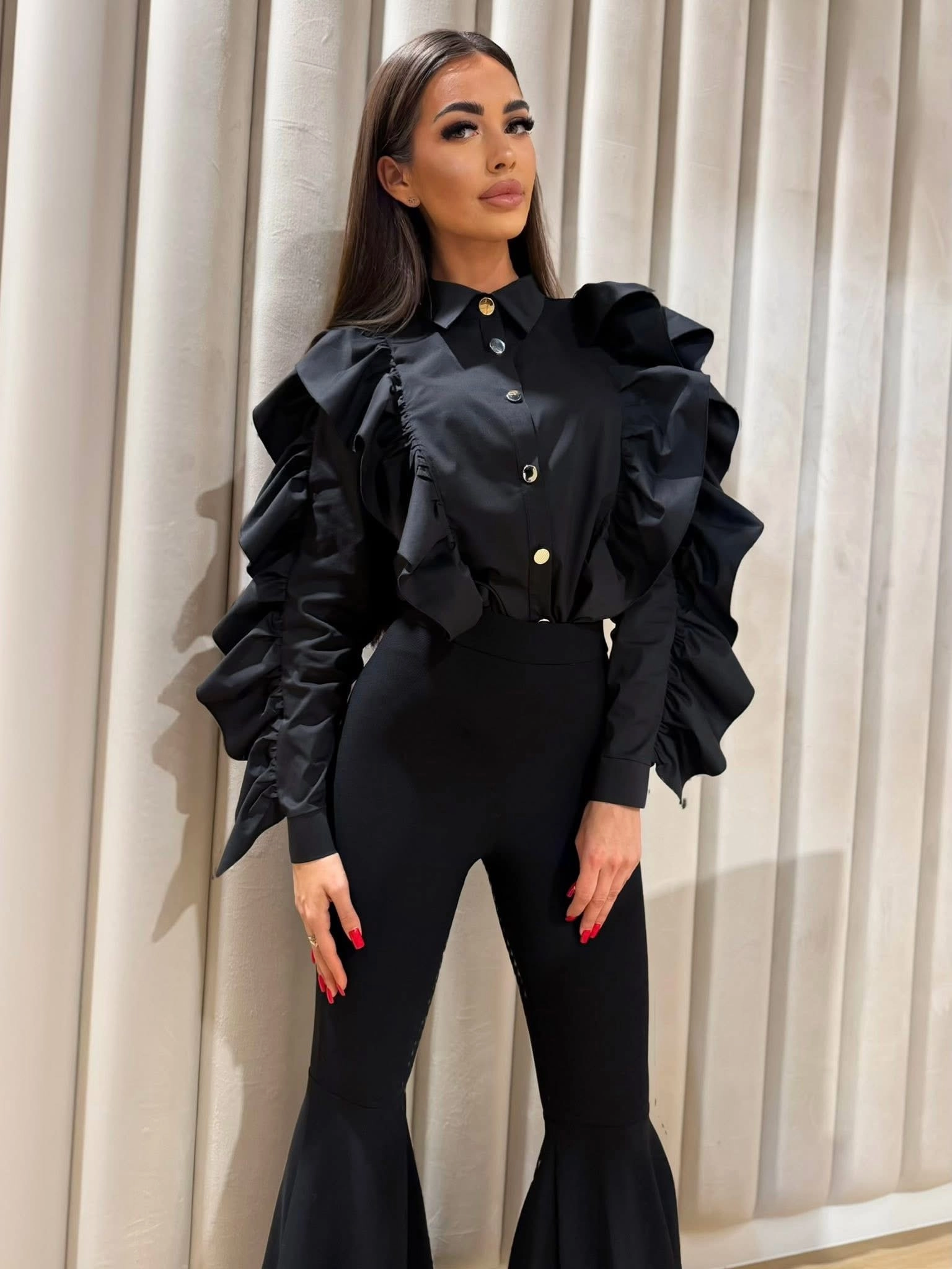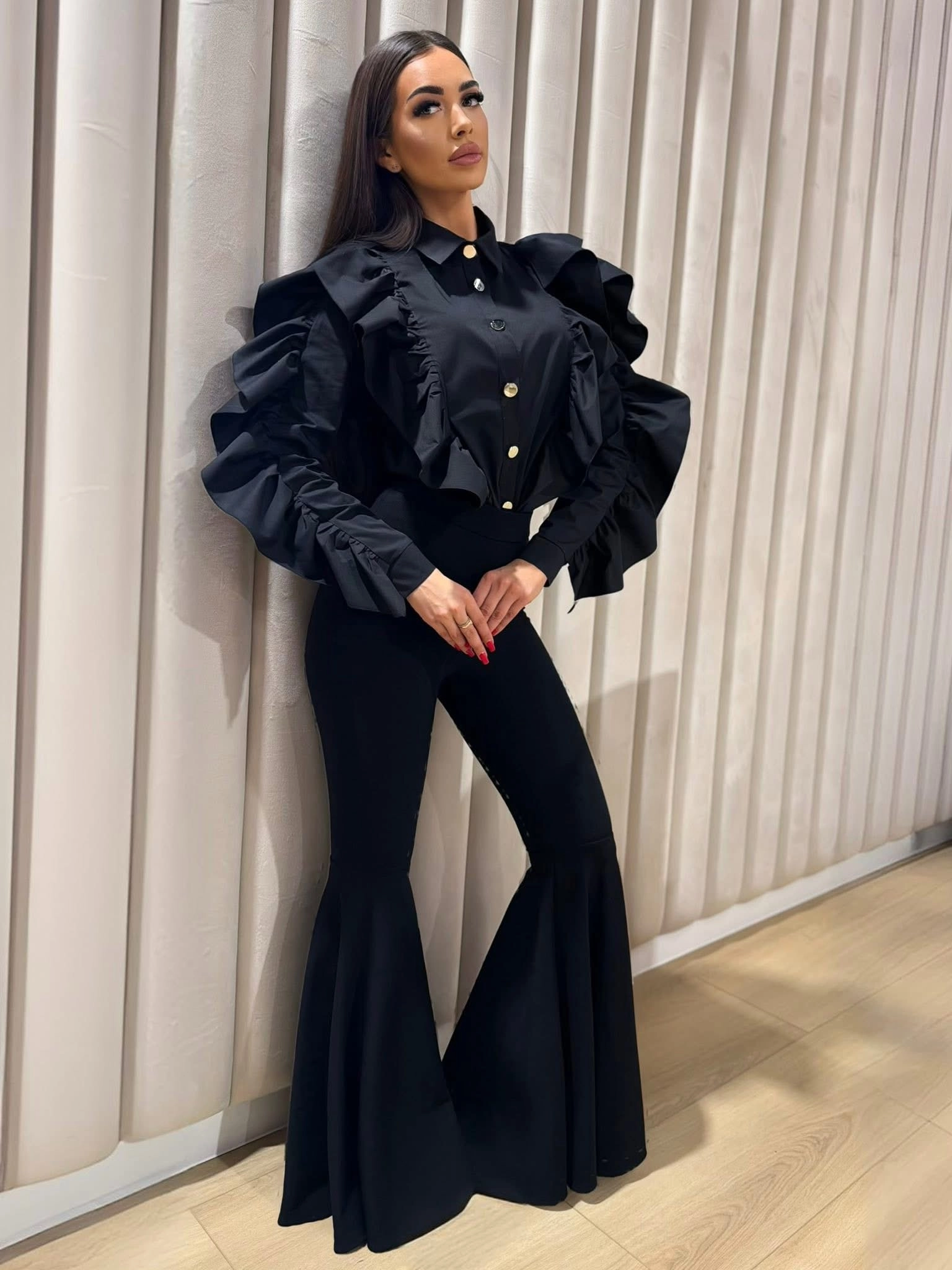Idealnie skrojona, z efektownymi dużymi falbanami. Wykończona złotymi guzikami, które nadają jej, luksusowego charakteru.