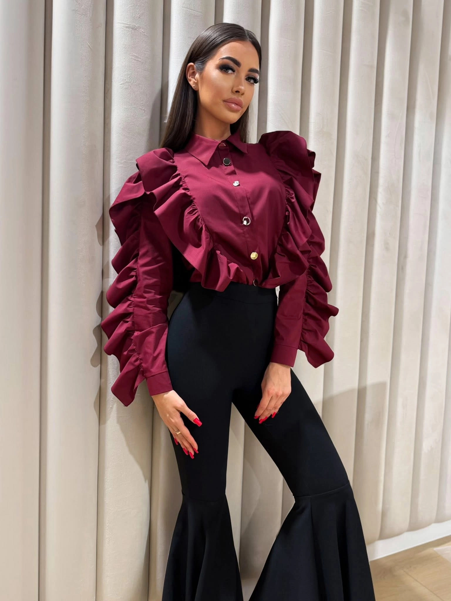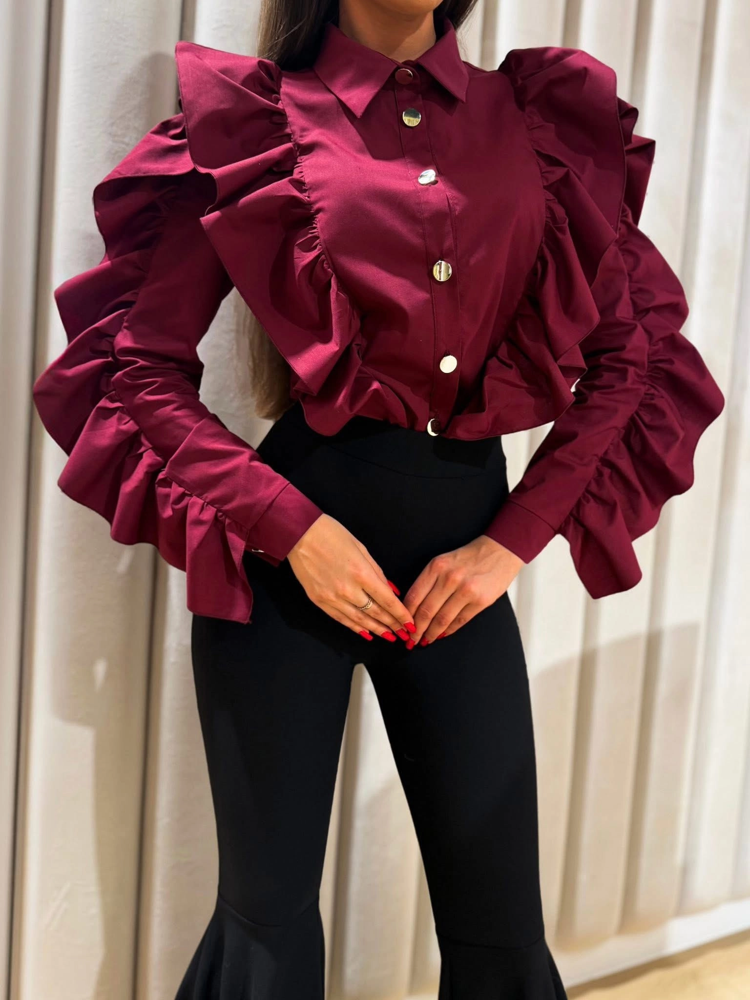 Idealnie skrojona, z efektownymi dużymi falbanami. Wykończona złotymi guzikami, które nadają jej, luksusowego charakteru.