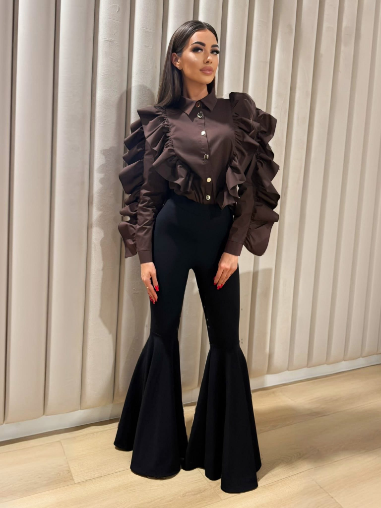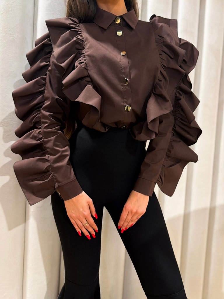 Idealnie skrojona, z efektownymi dużymi falbanami. Wykończona złotymi guzikami, które nadają jej, luksusowego charakteru.