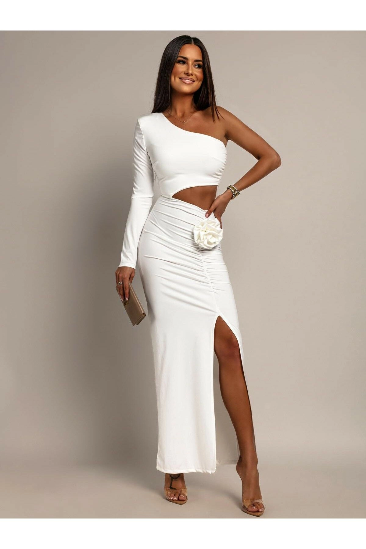 Długość maxi, piękny, klasyczny fason. Elegancki design, odkryte ramię. Sukienka posiada poduszkę na ramieniu. Aplikacja kwiatka jest odpinana.